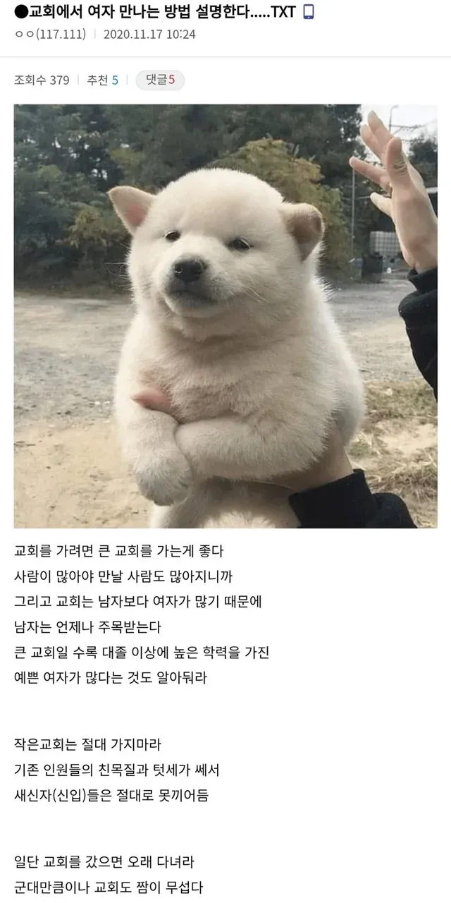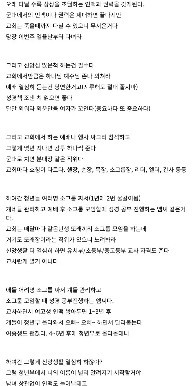 교회는 ㄹㅇ 여자가 많다 남자는 다들 냉소적이고 안가는데 오히려 블루오션일수있다 개붕이들아