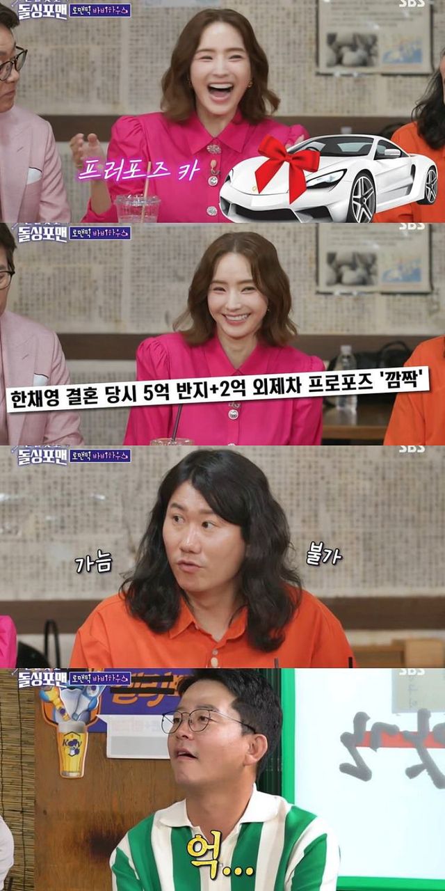 이상민이 “5캐럿 다이아몬드 반지와 2억 외제 차 프러포즈로 결혼 당시 화제가 되지 않았냐”고 묻자, 한채영은 “청담동의 한 숍에서 메이크업을 하고 있는데, 꽃이 배달됐다. 꽃다발에 박스가 있었는데 그걸 여니 차 키가 있더라”고 프러포즈 당시를 회상했다.