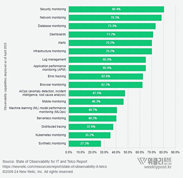 뉴렐릭이 IT 및 통신 업계 옵저버빌리티 현황 보고서를 발간했다. 이 보고서는 IT 및 통신 업계의 옵저버빌리티 도입 현황 및 비즈니스 가치를 분석한 내용이다. 보고서에 따르면, 클라우드 네이티브 애플리케이션 아키텍처 개발, AI 기술 도입, 멀티 클라우드 환경으로의 마이그레이션 등이 옵저버빌리티 도입의 주요 요인으로 꼽혔다.
