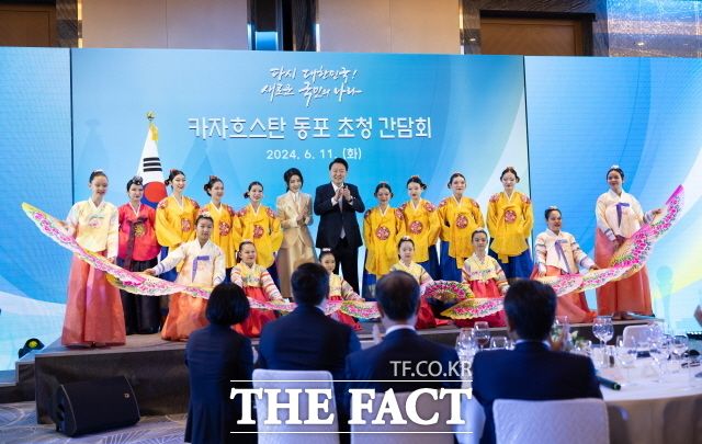 윤석열 대통령과 김건희 여사가11일(현지시간) 카자흐스탄에 도착해 첫 일정으로 현지 동포와의 간담회에 참석했다. 카자흐스탄 아스타나의 한 호텔에서 열린 고려인 동포·재외국민 초청 간담회에 참석해 고려인 동포 청소년 무용단의 문화공연을 관람한 뒤 함께 기념촬영 하고 있다. /뉴시스