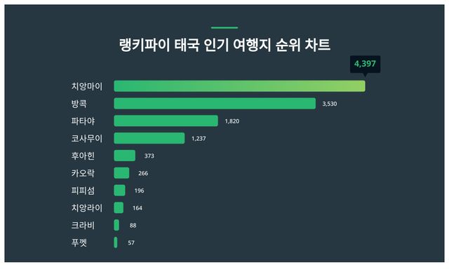 차트를 살펴보면 치앙마이가 4,397포인트로 해당 부문 1등을 기록했다. 바로 뒤 방콕이 3,530포인트로 2등을 차지했다.