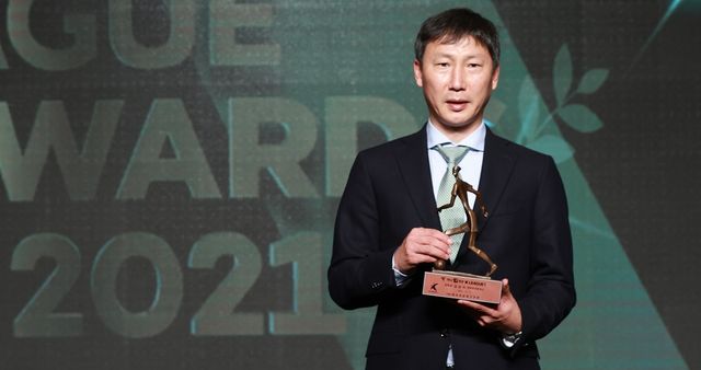 김상식 감독이 2021년 12월 7일 오후 서울 서대문구 스위스그랜드호텔에서 열린 2021 프로축구 K리그1 시상식에서 감독상을 받은 뒤 트로피와 함께 기념 촬영을 하고 있다. / 연합뉴스