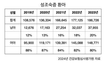 최근 몇 년간의 데이터에 따르면 성조숙증 진단을 받은 어린이의 수가 특히 남자아이에게서 크게 증가한 것으로 나타났다. 이 질환으로 치료받는 남아는 여아보다 더 빠르게 증가하는 것으로 확인되었다. 20019년에는 성조숙증 치료를 받는 남아는 전체 아동의 12% 였으나, 2023년에는 20%까지 증가를 했다.