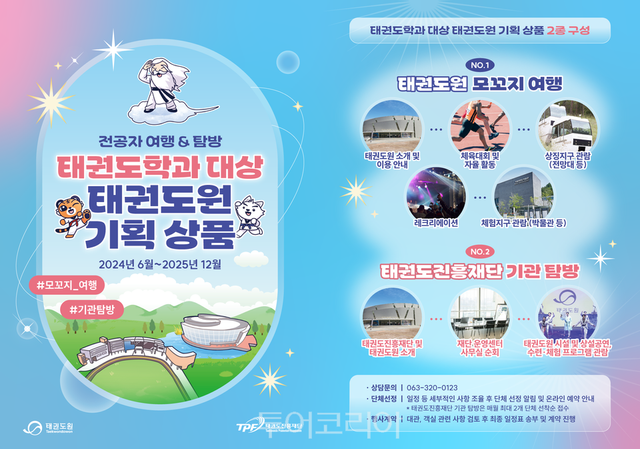 [투어코리아=유경훈 기자] 태권도진흥재단은 ‘대학교 태권도학과’만을 위한 ‘태권도원 모꼬지 여행’과 ‘태권도진흥재단 기관 탐방’ 기획 상품 2종을 출시하며 태권도 전공생들의 모임과 진로 탐색을 지원한다.