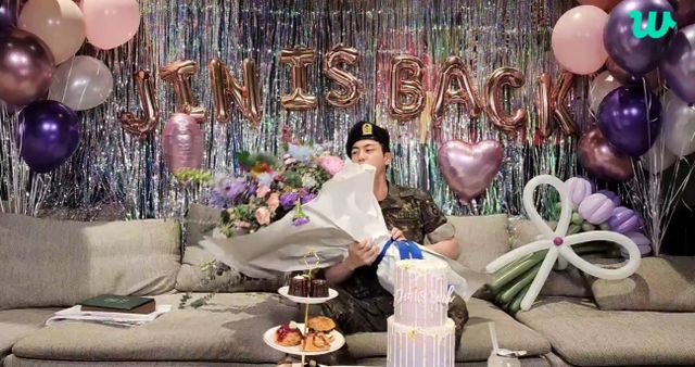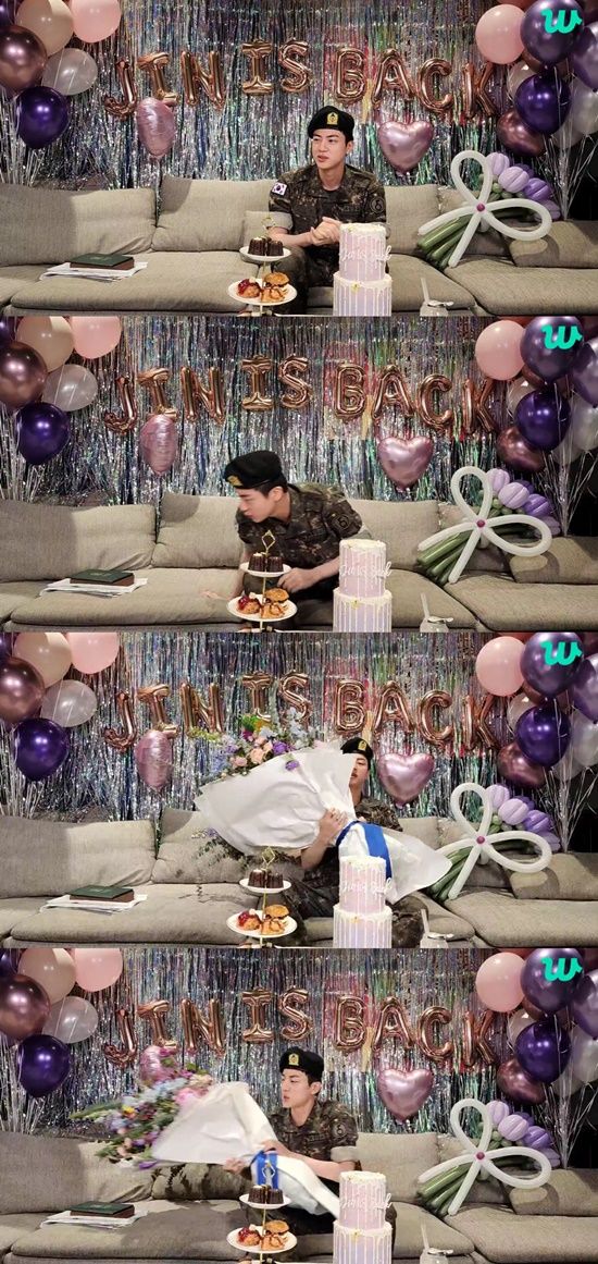 특히 진은 이날 전역식에서 눈물을 보이기도. 그는 "전역식 때 울었다. 그래서 얼굴이 부었다"며 "얼굴에 자신있는 타입인데 오늘 자신감이 좀 덜하다. 멤버들과 와서 축하해주고 깜짝 놀란건 회사 들어왔는데 모든 구성원 분들이 플랜카드랑 샴페인 꽃을 주셨다"고 했다.
