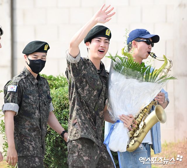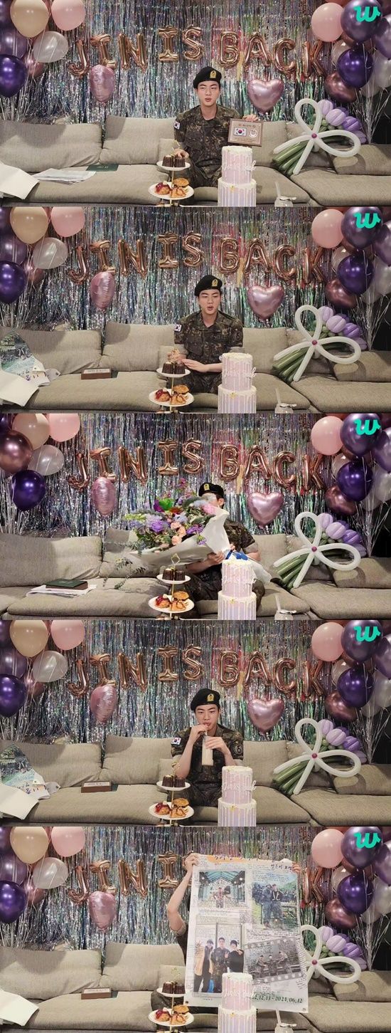 진은 "전역식 때 울었다. 그래서 얼굴이 부었다. 얼굴에 자신있는 타입인데 오늘 자신감이 좀 덜하다. 멤버들과 와서 축하해주고 깜짝 놀란건 회사 들어왔는데 모든 구성원 분들이 플랜카드랑 샴페인 꽃을 주셨다"며 "너무 기쁘고 눈물도 나고 두 번 울었다. 원래 울지 않으려 했다. 군인으로서 이야기하자면 후임들이 저를 보내주니까 절대 울지 말라고 했다. 나까지 우니까 그러지 말라고 했다"고 했다.