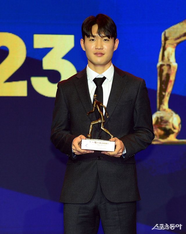 광주 정호연이 지난해 12월 4일 서울 송파구 롯데호텔월드에서 열린 ‘2023 하나원큐 K리그 대상’ 시상식에서 K리그1 영플레이어상을 수상한 뒤 기념촬영을 하고 있다. 스포츠동아DB