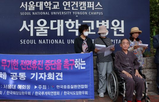 한국중증질환연합회는 12일 서울 종로구 서울대병원 앞에서 서울대병원 교수진의 무기한 전면 휴진을 촉구하는 기자회견을 열었다. 중증질환자단체 대표들은 히포크라테스 선서를 무시하는 행위와 다름없다며 집단휴진 철회와 참여 의료진 처벌을 의료계와 정부에 각각 요구했다.