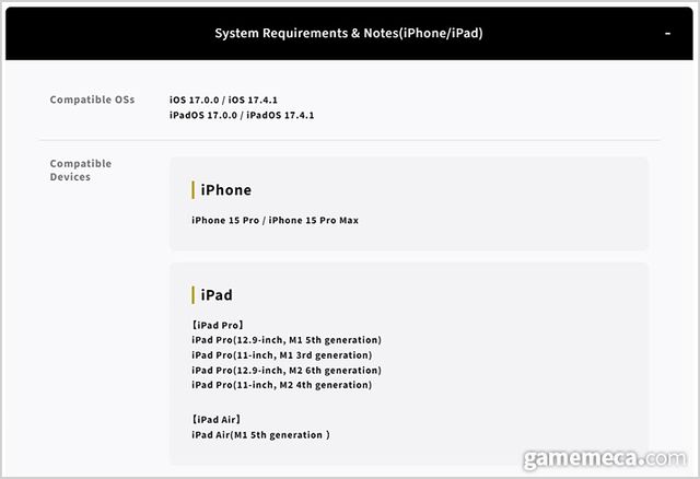 이번 애플 이식 버전은 아이폰 15 프로와 아이폰 15 프로 맥스 등 최신 기기에서 플레이할 수 있으며, M1 칩 이상이 탑재된 아이패드 에어, 아이패드 프로, 맥북 에어, 맥북 프로, 아이맥 등에서 즐길 수 있다. 또한 애플 MetalFX 업스케일링 기술을 활용해 본편 못지 않은 품질을 선보일 예정이다. 아울러 플레이스테이션 듀얼 센스나 Xbox 컨트롤러 등 외부 무선 컨트롤러를 연결해 플레이할 수 있으며, 구매 전 미리 게임을 해볼 수 있도록 체험 버전을 제공한다.