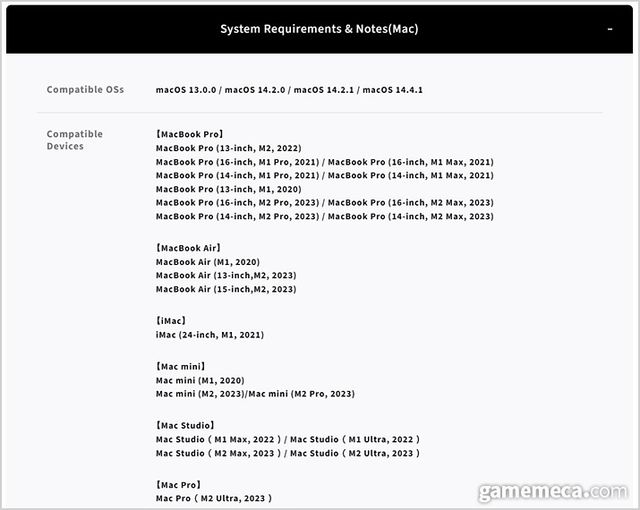 그 외에도 애플은 지난 6월 11일 진행된 WWDC 2024에서 MacOS으로 이식되는 게임 12종(어쌔신 크리드 섀도우스, 데드 아일랜드 2, 스나이퍼 엘리트 4, 명조: 워더링 웨이브, 컨트롤, 팰월드, 리븐, 페르시아의 왕자: 잃어버린 왕관, 발헤임, 프로스트펑크 2, 로보캅: 로그 시티)을 추가로 공개했다. 대부분 정확한 출시일은 공개되지 않았으나, 어쌔신 크리드 섀도우스는 콘솔과 동일하게 11월 15일 발매된다.