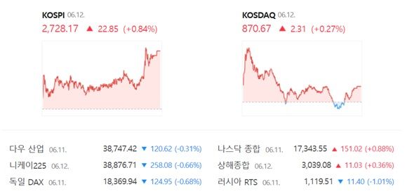 12일 한국거래소에 따르면 이날 코스피는 전 거래일(2705.32) 대비 0.84%(22.85포인트) 오른 2728.17로 거래를 끝냈다. 외국인과 기관은 각각 2339억원, 108억원을 사들였다. 개인은 홀로 2434억원을 순매도했다.