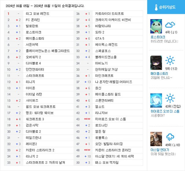 이번 주 중위권에서는 넥슨 고전게임 진영이 큰 폭으로 상승했다. 각각 4계단, 5계단 올라 27위와28위에 랭크된 크레이지 아케이드 비엔비와 바람의나라다. 두 게임이 20위대에 든 것은 실로 몇 년 만이다. 두 게임 모두 5월 30일부터 동시다발적으로 시작된 여러 이벤트에 탄력을 받은 것으로 보이지만, 현재 분위기에 여름 업데이트만 적절하게 붙어준다면 장기간 기세를 유지할 가능성도 있다.