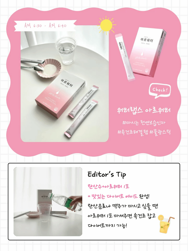 에디터는 속건조까지 완전히 잡기 위해 그냥 맹물이 아닌 워터랩스의 아르워터 한 포를 타서 마시는 걸 모닝 루틴으로 하고 있다. 밤새 메말라버린 우리 몸의 건조함을 잡기 위해선 생수만으로는 사실 부족하다.