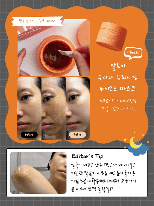 딥클렌징으로 비워버린 피부에는 확실한 수분과 영양을 꽉꽉 눌러 가득 담아줘야 한다. 이때, 에디터가 가장 많이 사용한 제품이 바로 모공지우개팩! 알로이 구아바 퓨리파잉 워시오프 마스크다.