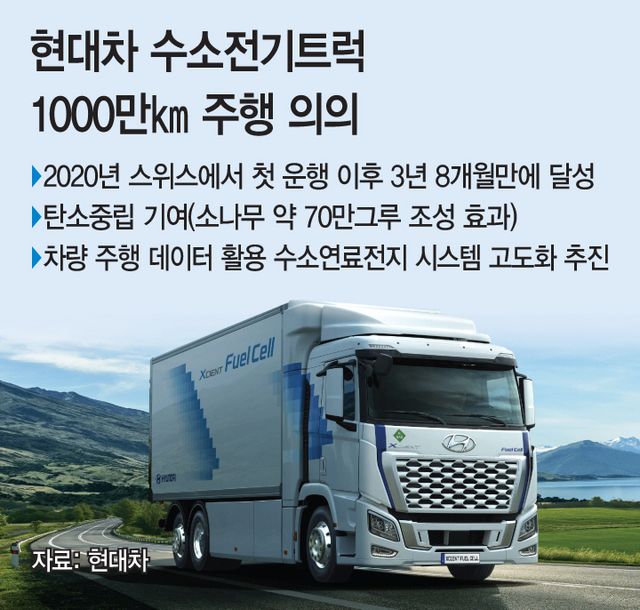 12일 현대차에 따르면 엑시언트 수소전기트럭의 1000만㎞ 운행은 일반 디젤 상용 트럭과 비교했을 때 약 6300톤의 이산화탄소 절감 효과가 있다. 이는 수령 30년의 소나무 약 70만 그루가 연간 흡수하는 탄소량으로 508만㎡의 소나무 숲을 조성하는 것과 동일한 효과를 거둘 수 있다. 특히 스위스에서 운행되는 엑시언트 수소전기트럭은 생산과정에서 탄소가 발생하지 않는 '그린수소'만을 연료로 사용해 그 의의가 더욱 크다.