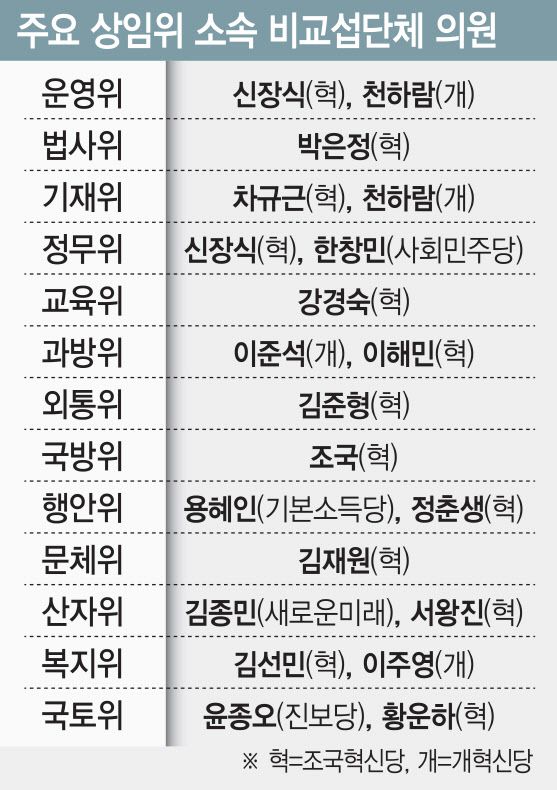 기획재정위원회는 천하람 개혁신당 원내대표와 차규근 조국혁신당 의원이, 정무위원회에는 신장식 조국혁신당 대변인과 한창민 사회민주당 대표가 포함됐다. 이들보다 덜하지만 인기 상임위로 통하는 교육위원회에는 교수 출신 강경숙 조국혁신당 의원이 배정됐다.