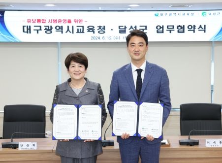 [파이낸셜경제=김영란 기자] 대구시교육청은 6월 12일 15:30 달성군청 상황실에서 강은희 교육감, 최재훈 군수, 김태헌 달성교육지원청교육장 및 각 기관 관계자들이 참석한 가운데 달성군과 유보통합 시범 운영을 위한 업무 협약을 체결한다고 밝혔다.