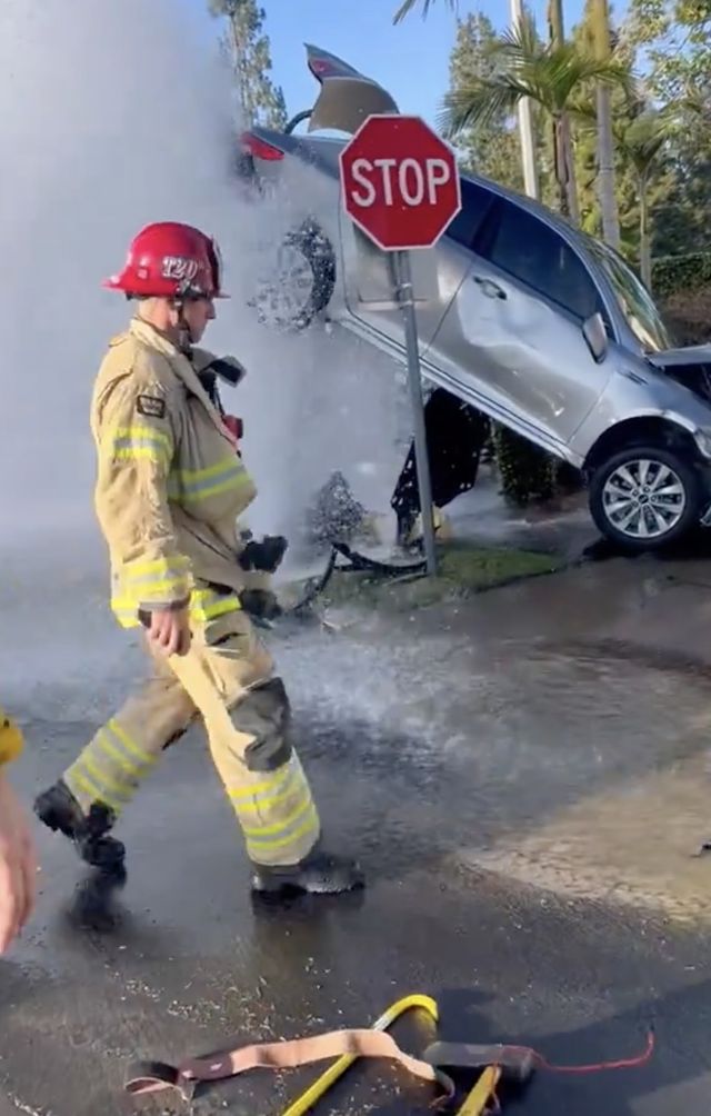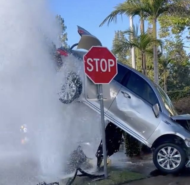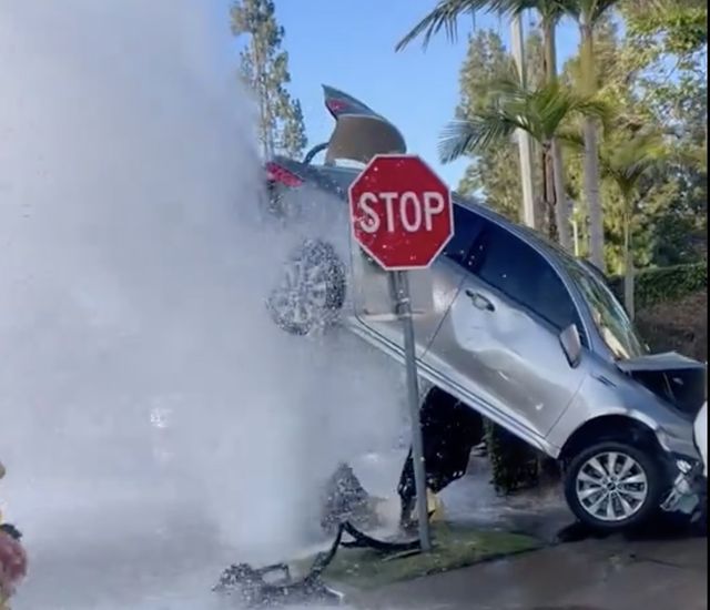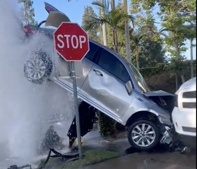 기아 옵티마(국내명 K5) 차량이 소화전에 부딪혀 공중으로 떠오른 채 정지했다. 소화전에서 물이 뿜어져 나왔고, 은색 옵티마의 뒷부분은 지면에서 약 2m 이상 솟구쳤다.