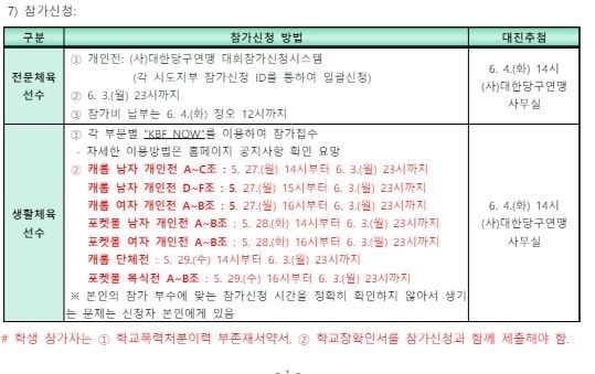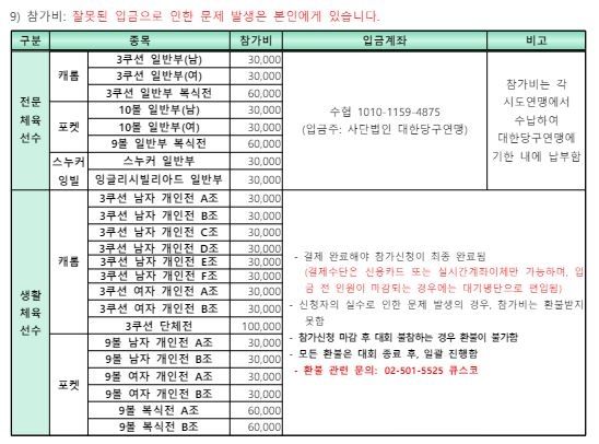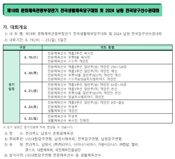 1. 대회명: 제19회 문체부장관기 전국생활체육당구대회 및 2024 남원 전국당구선수권