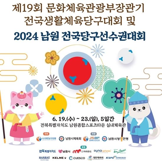 대한당구연맹(회장 박보환)은 오는 19일부터 23일까지 전북 남원종합스포츠타운 실내체육관에서 ‘제19회 문화체육관광부장관기 전국생활체육당구대회 및 2024 남원 전국당구선수권대회’를 개최한다고 12일 밝혔다.