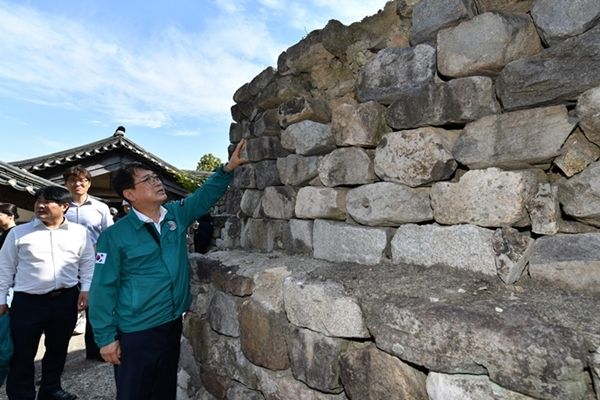 최응천 국가유산청장이 12일 지진 피해를 입은 전북 부안 내소사를 방문해 담장석 탈락 상태를 점검하고 있다. / 뉴스1