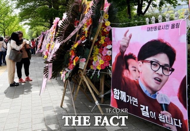 한동훈 전 국민의힘 비상대책위원장이 7월 전당대회 당 대표 경선에 출마할지 관심이 쏠린다. 지난 4월 한 전 위원장을 응원하는 문구가 적힌 화환들이 국회 헌정회관 담벼락에 세워진 모습. /배정한 기자