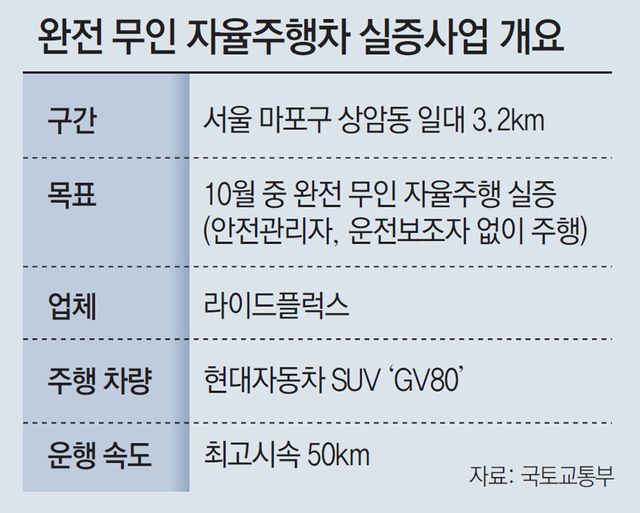 이르면 10월부터 운전자가 아예 탑승하지 않은 무인 승용차가 일반 도로를 달리는 모습을 볼 수 있게 된다. 안전관리자나 운전보조자가 없는 ‘완전 무인’ 자율주행차 실증 사업이 이뤄지는 건 이번이 처음이다.
