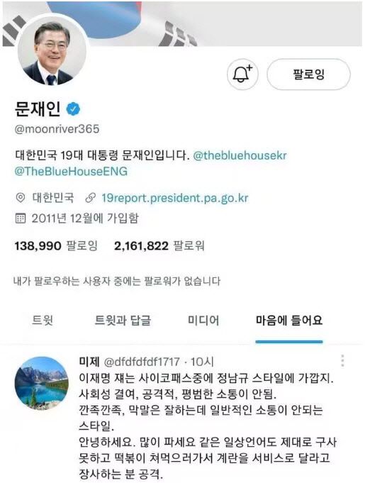 문재인 전 대통령의 경우 지난 2022년에 이재명 더불어민주당 대표를 “사이코패스”라고 원색적으로 비방한 게시글에 ‘마음에 들어요’를 눌렀다가 취소하는 해프닝이 벌어지기도 했다. 지난 2월에도 문 대통령 엑스 계정은 ‘이준석 사당화_이재명 사당화’ 등 해시태그가 달린 글에 ‘마음에 들어요’를 눌렀다가 취소했다. 문 전 대통령은 자신의 ‘마음에 들어요’ 목록에 대해 “트위터에 ‘좋아요’ 누르는 범인. 드디어 색출”이라며 반려묘인 찡찡이가 태블릿PC 위에 올라가 있는 모습의 사진을 공개했다.