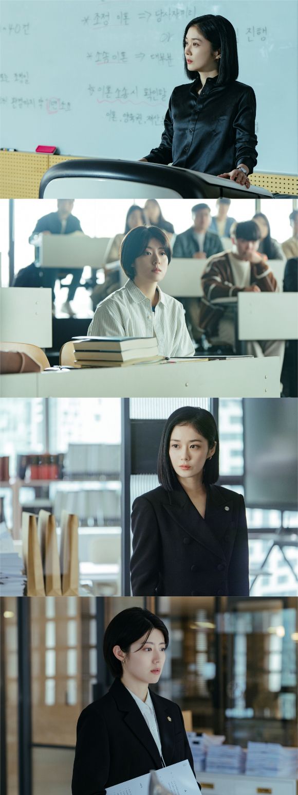 그런 가운데 공개된 차은경과 한유리의 스틸은 '단짠' 워맨스에 대한 기대감을 한층 끌어올린다. 차은경과 한유리는 첫 만남부터 스파크가 터진다. 로스쿨 특강에 나선 이혼전문변호사 '차은경'은 한 치의 흐트러짐 없는 모습. 그러나 무언가 거슬리기라도 한 듯 날카로운 시선이 닿는 곳엔 무미건조한 얼굴을 한 한유리가 있다. 두 사람 사이에 감도는 싸늘한 분위기 역시 흥미롭다. 어떤 일에도 흔들림 없는 차은경을 자극한 한유리, 첫 만남부터 강의실을 얼어붙게 만든 사건은 무엇일지 궁금해진다.