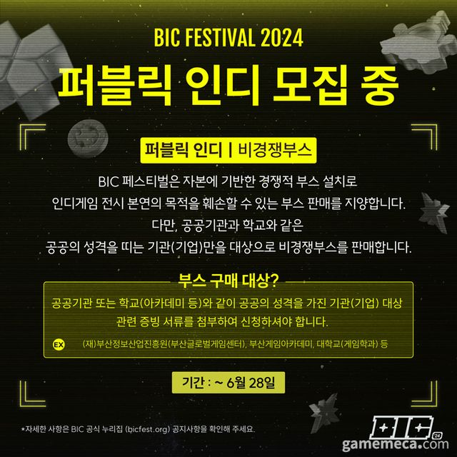 퍼블릭 인디는 BIC 페스티벌 비경쟁 부스로, 게임 관련 공공기관·교육기관 등 기관(기업)을 대상으로 한다. 게임 전시·홍보·비즈니스 미팅 등으로 활용할 수 있다.
