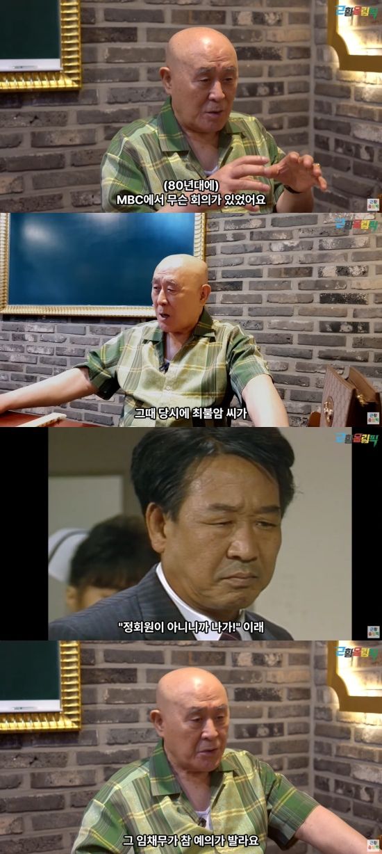 이어 "그러니까 제가 눈빛이 이상했고, 인상을 쓰면서 돌아서서 나오는데, 임채무가 참 예의가 바르다. '불암이 형, 조춘 선배님이 나이가 몇인데 반말을 해' 하더라. 저는 로비에서 분을 삭이고 있었는데, 둘이 딱 나오더니 '형님 죄송합니다' 하더라. 그래서 '(사과해줘서) 고맙다' 했다"면서 최불암이 자신보다 나이가 많은 줄 알고 반말을 했던 사연을 전했다.