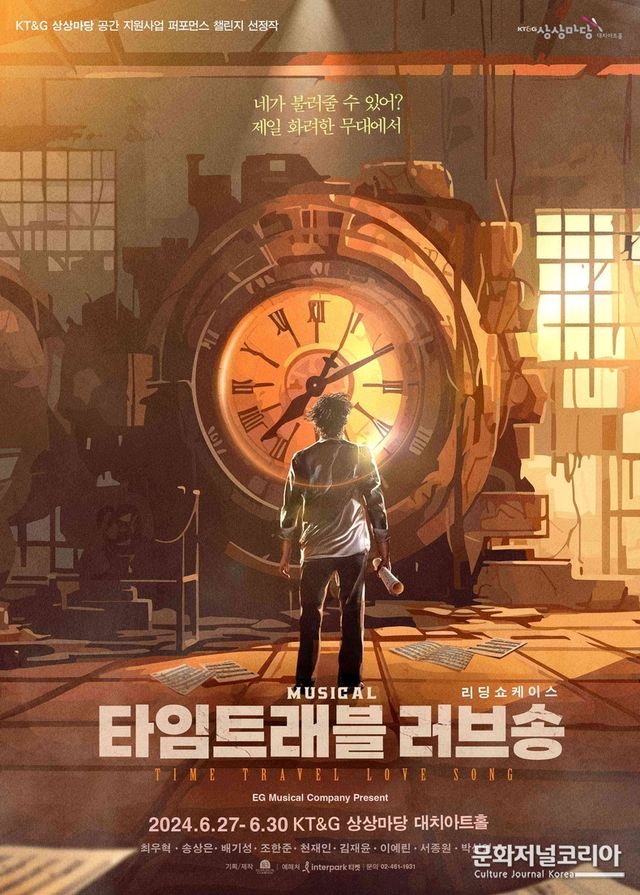 문화저널코리아 김영일 기자 | KT&G 상상마당 공간 지원사업 퍼포먼스 챌린지 선정작으로 선정된 뮤지컬 '타임트래블 러브송'이 오는 2024년 6월 27일부터 6월 30일까지 KT&G 상상마당 대치아트홀에서 리딩 쇼케이스 형식으로 관객들과 만난다. 이번 작품은 EG 뮤지컬컴퍼니의 글로벌 프로젝트 일환으로 만들어진 신작으로, 뮤지컬 팬들에게 특별한 경험을 선사할 예정이다.