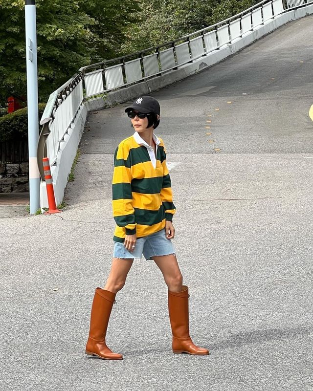 줄무늬의 원조를 찾으라면 김나영을 빼놓을 수 없다. 그의 SNS엔 스트라이프 티셔츠 스타일이 가득하기 때문. 김나영도 역시 루즈핏 스트라이프 티셔츠와 데님 쇼츠를 함께 연출했다. 다른 점이 있다면 아무나 소화하기 힘든 롱부츠와 선글라스를 활용해 김나영만의 스타일을 만들어 낸 것!