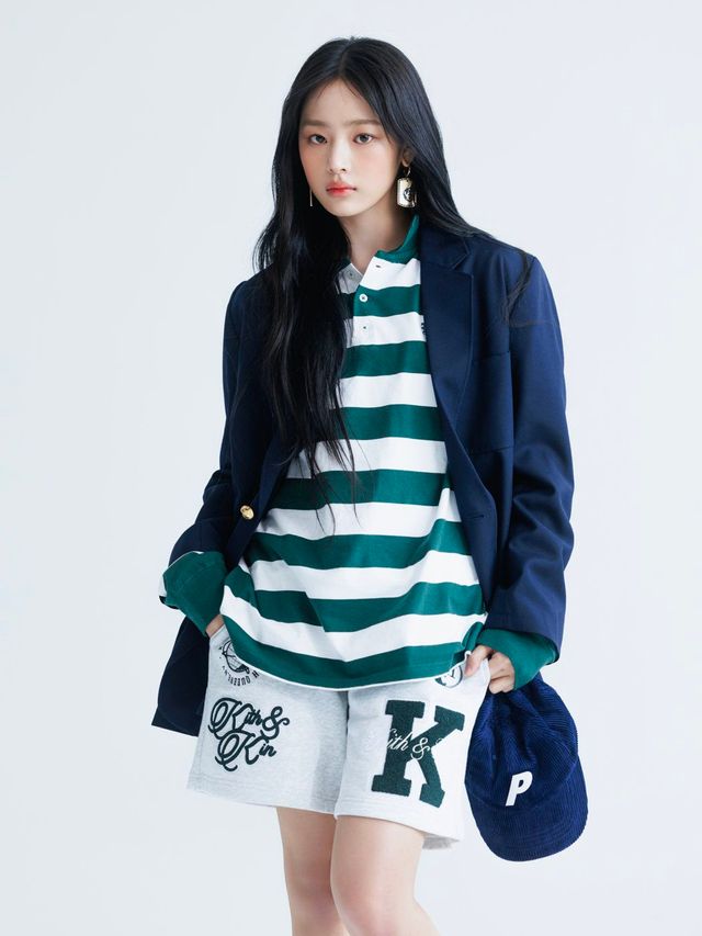 기자회견 민희진의 미니미인듯, 뉴진스의 민지는 품이 넉넉한 럭비 셔츠와 볼캡 매치를 선보였다. 귀여운 트레이닝 쇼츠와 발목까지 올라오는 삭스가 포인트. 자칫 편안하게만 보일 수 있는 룩에 재킷을 얹어 포멀함을 더하는 것도 잊지 않았다.