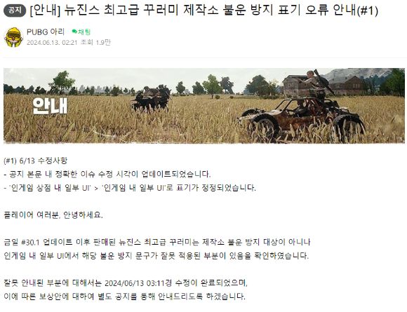 크래프톤 측은 이날 새벽 공지사항을 통해 "뉴진스 최고급 꾸러미는 제작소 불운 방지 대상이 아니나, 인게임 내 일부 UI에서 해당 불운 방지 문구가 잘못 적용된 부분이 있음을 확인했다"고 사과했다. 표기 오류도 수정된 상태다.