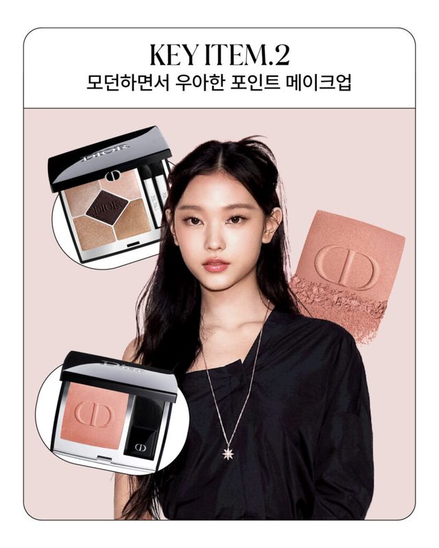 해린의 반전 매력이 돋보였던 이번 메이크업 룩의 핵심은 바로 섀도와 블러셔. 은은한 느낌의 음영감과 포인트 글리터가 더해진 아이 메이크업에 사용한 제품은 디올쇼 5 꿀뢰르 #539 그랑발!