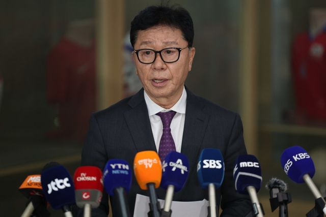 정해성 축구국가대표 전력강화위원장이 지난 4월 2일 서울 종로구 대한축구협회에서 제5차 전력강화위원회 결과 브리핑을 마친 뒤 취재진 질문에 답하고 있다. / 연합뉴스