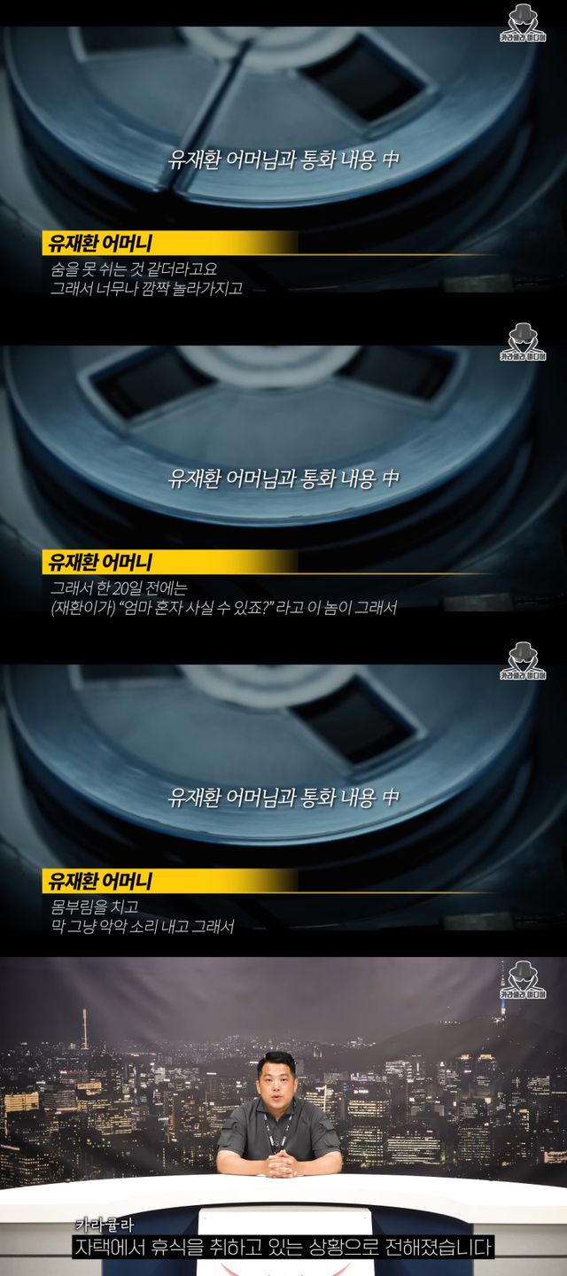 유재환의 어머니는 “재환이가 일을 저질렀다. 그래서 지금 응급실에 있다. 상태가 호전이 안되고 있다”며 “방에서 안 나오길래 자는 줄 알았는데 숨을 못 쉬었다. 119를 불렀다”고 말했다. 이어 그는 “20일 전에는 ‘엄마 혼자 사실 수 있죠?’라고 그래서 마음 약하게 먹지 말라고 했다”며 “애가 내성적이고 말을 잘 안하고 누구하고 이야기도 잘 안한다”고 설명했다. 이어 “조금 살아났다. 산소호흡기를 막 떼려고 하고 몸부림을 치고 악악 소리낸다고 한다”고 상황을 전했다.