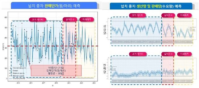 분석모델이 예측한 예측값 범위 안에 한국수산자원공단이 시행한 실태조사 결과(판매단가, 생산량) 값이 포함됨으로써 현장 활용성이 높은 것으로 확인됐다.