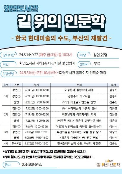 현재 길 위의 인문학 프로그램 수강생 접수는 완료됐으며 6월 14일(금)부터 시작된다. 1차 프로그램(6/14~6/28)은‘절망의 순간에도 멈출 수 없었던 예술, 그리고 삶’을 주제로 범일동 '거리 미술관'을 탐방할 예정이며, 2차 프로그램(7/12~7/26)은 ‘부산이라는 장소성, 아트페어’주제로 해운대 '이우환 공간'을, 3차 프로그램(9/6~/27)은‘부산미술의 태동과 그 발전양상’주제로 부산진구 '김종식 미술관'을 탐방할 예정이다.