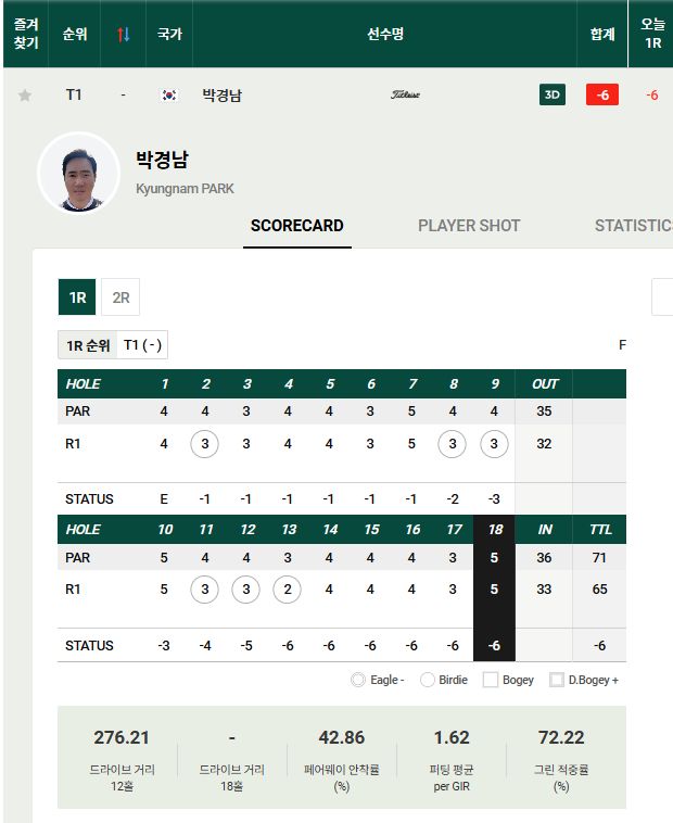 1R : 6언더파 65타 (버디 6개) 공동1위