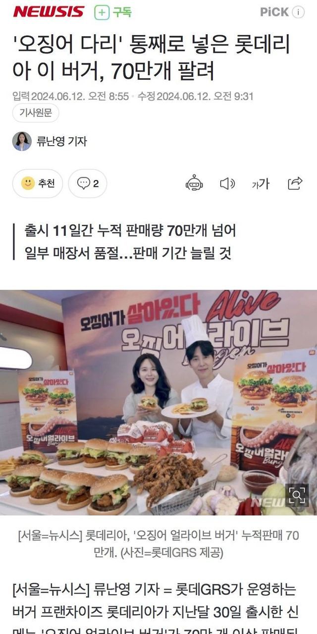 '오징어 다리' 통째로 넣은 롯데리아 이 버거, 70만개 팔려