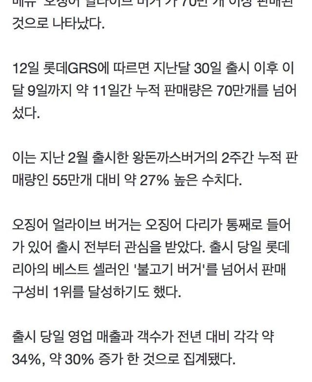 롯데GRS가 운영하는 버거 프랜차이즈 롯데리아가 지난달 30일 출시한 신 메뉴 '오징어 얼라이브 버거'가 70만 개 이상 판매된 것으로 나타났다. 12일 롯데GRS에 따르면 지난달 30일 출시 이후 이달 9