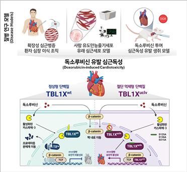 (그림설명 : 독소루비신에 의해 TBL1X 단백질이 절단되고 이로 인해 WNT 신호전달이 억제돼 심장 세포의 세포사멸이 일어난다. 이러한 연구 결과는 확장성 심근병증 환자 조직, 사람유도만능줄기세포 유래 심근세포, 심장 독성 동물 모델에서 확인됐다.)