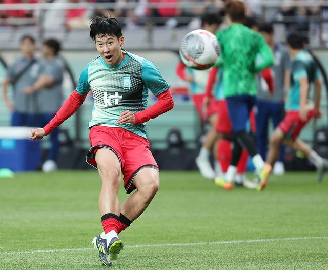 2024년 6월 11일 오후 서울 마포구 상암동 서울월드컵경기장에서 열리는 2026 북중미 월드컵 아시아 2차 예선 조별리그 C조 6차전 대한민국과 중국의 경기를 앞두고 대한민국 손흥민이 슈팅 연습을 하고 있다. / 뉴스1