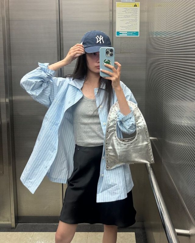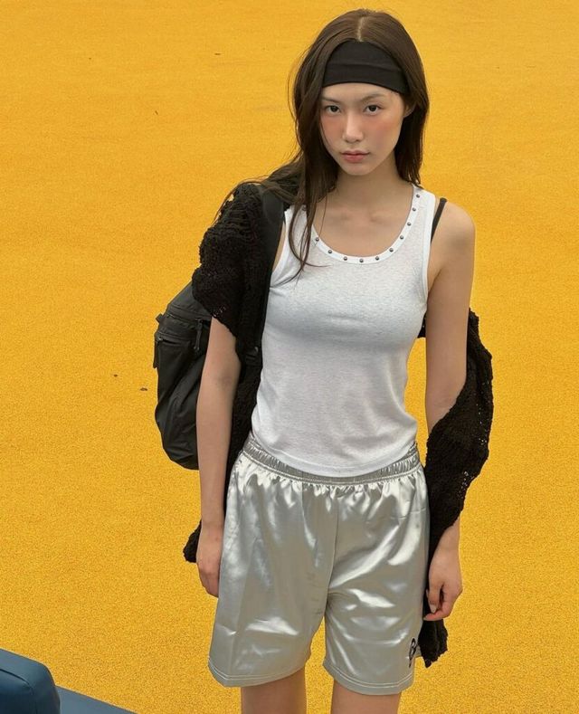 야외 활동을 즐길 예정이라면 실버 쇼츠나 스커트를 활용해 보세요. 내리쬐는 햇살에 실버 원단이 은은하게 빛나면서 한 층 더 스타일리시 해 보일 겁니다. 이때 코팅된 느낌의 실버 원단이 자칫 답답해 보일 수 있기 때문에 두꺼운 소재 보다는 얇은 나일론이나 비스코스 소재의 아이템을 추천할게요.