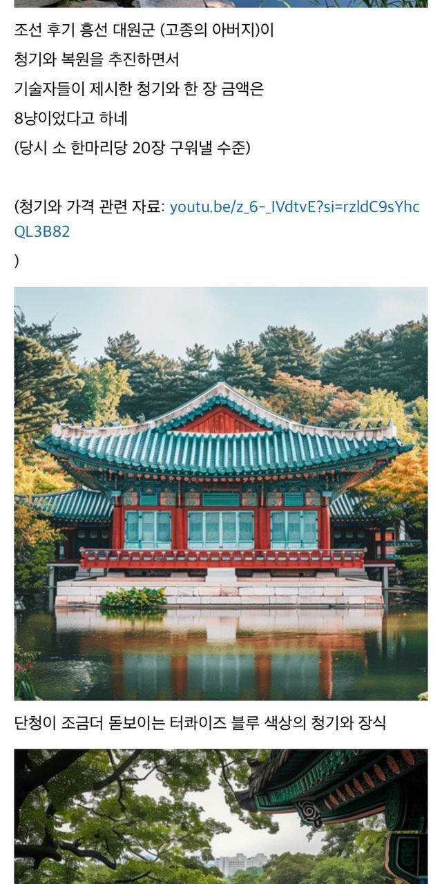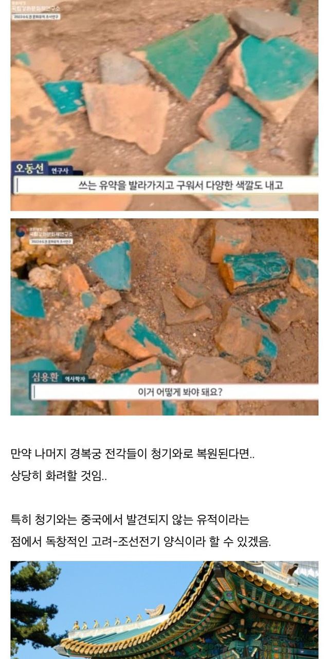 청기와는 푸른색을 띠는 기와를 의미합니다. 전통적으로 중요한 건물의 지붕에 사용되었으며, 그 색상과 질감 덕분에 단아하고 웅장한 미관을 자랑합니다. 경북궁에서 출토된 청기와는 조선 시대 고유의 건축 양식을 이해하는 데 중요한 단서가 됩니다.