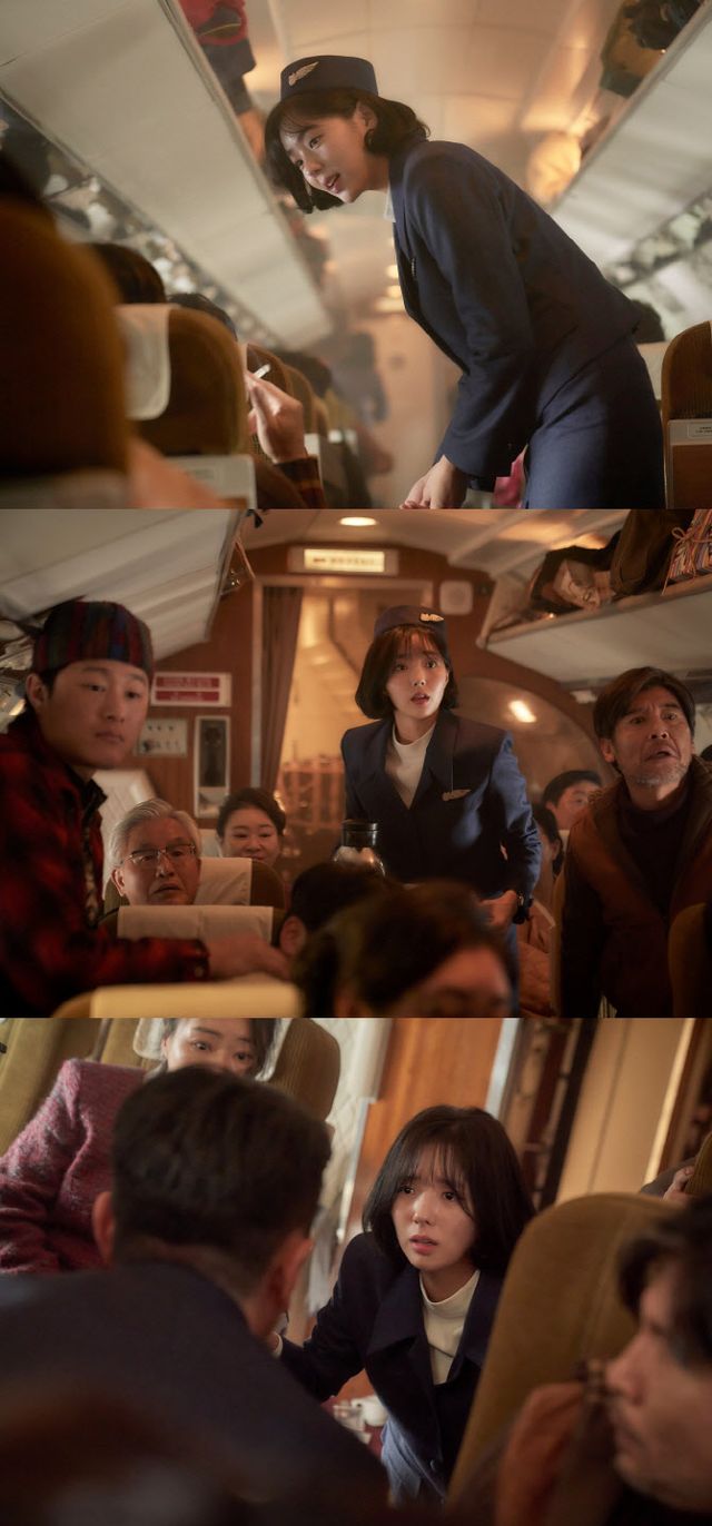 먼저 깔끔한 유니폼에 살짝 기울여 쓴 모자, 단정한 단발머리까지, 채수빈은 1970년대 승무원 그 자체인 듯한 모습으로 눈길을 사로잡는다. 더불어, 승객들을 향한 그의 초롱초롱한 눈망울과 다정한 미소는 극 중 인물이 가진 직업에 대한 애정을 엿보게 하기도. 반면, 앞서 공개된 1차, 2차 예고편 속 채수빈은 검게 얼룩진 얼굴에 흐트러진 헤어스타일로 비주얼 변화를 보여주며 앞으로 불어닥칠 파란을 더욱 궁금하게 했다.