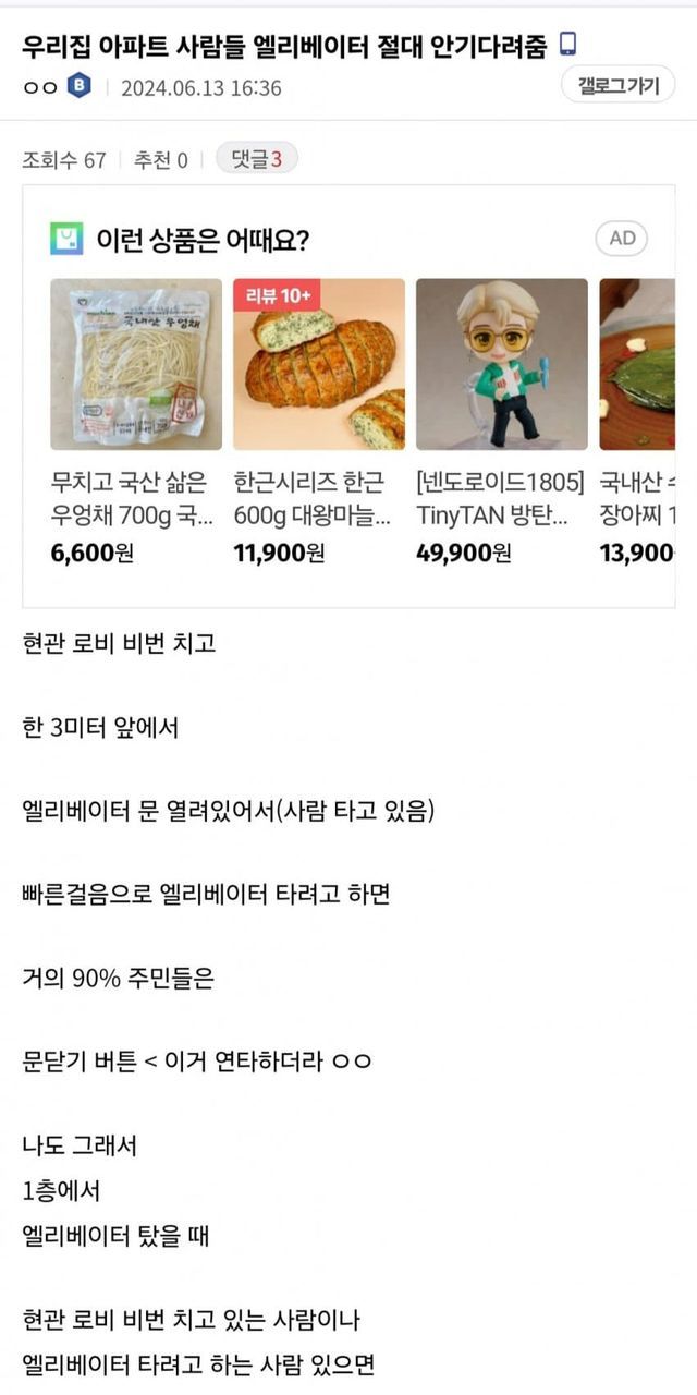 우리집 아파트에서 종종 일어나는 문제 중 하나는 엘리베이터를 타는 사람들이 다른 사람들을 기다려주지 않는다는 점입니다. 엘리베이터 버튼을 빨리 닫으려고 하는 경우가 많아서 뒤따라 오는 사람들을 배려하지 않는 상황이 발생합니다. 이러한 행동은 비매너로 여겨지며, 개선이 필요한 부분입니다.