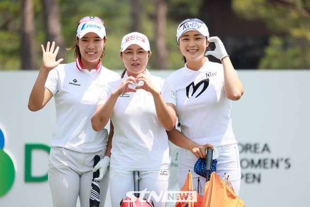 최민경이 서연정, 윤이나와 함께 1번 홀에서 경기하고 있다.